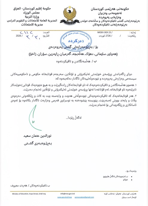 دوای ڕاگەیاندنی پرۆسەی خوێندنی ئەلیکترۆنی و ئۆنلاین، سەرجەم قوتابخانە حکومی و ناحکومییەکانی سیستەمی وەزارەتی پەروەردە و نێودەوڵەتییەکان ئاگادار دەکەینەوە کە: