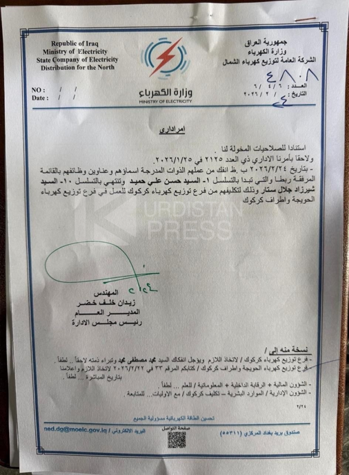 بڕیاری لکاندنی کارەبای چەند ناوچەیەکی کەرکووک بە حەویجە چووە بواری جێبەجێکردنەوە