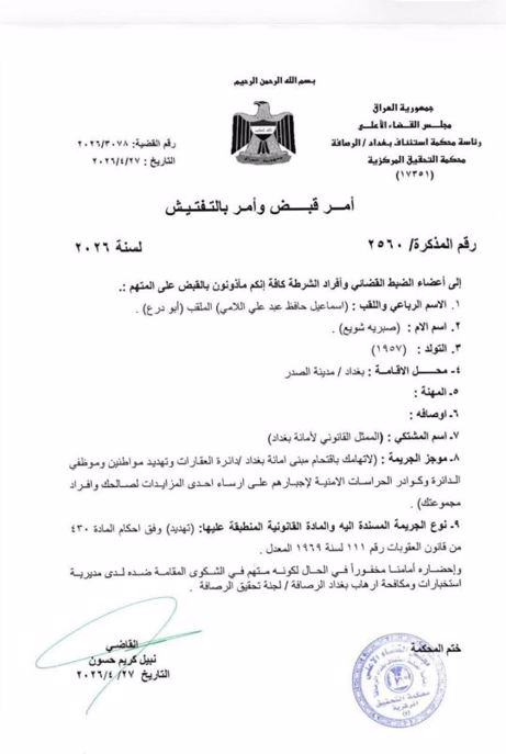 دادگای لێکۆڵینەوەی ناوەندی لە بەغدا، فەرمانی دەستگیرکردنی بۆ ئیسماعیل حافز لامی ناسراو بە "ئەبودرع" دەرکرد. ئەم بڕیارە دوای ئەوە دێت کە ئەمیندارێتیی بەغدا بەتۆمەتی هەڵکوتانە سەر فەرمانگەیەک و هەڕەشەکردن، سکاڵای یاسایی لە دژی تۆمار کردووە.